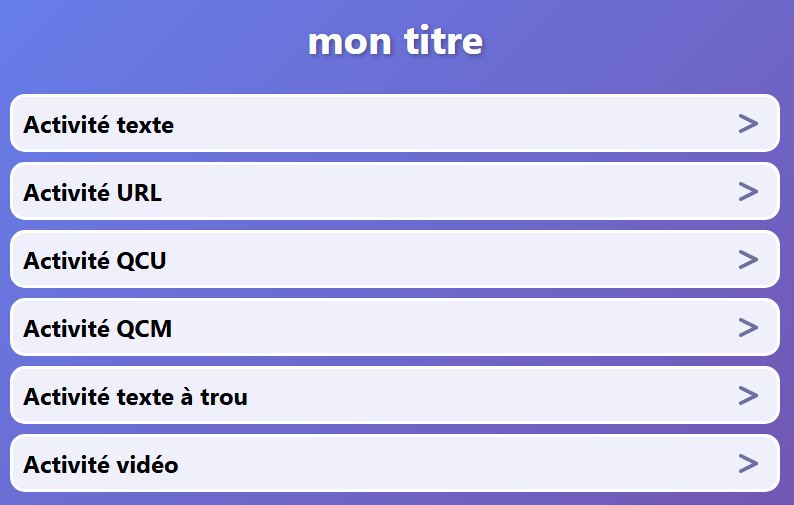Page web qui contient des activités (texte, URL, QCU, QCM, texte à trou, vidéo) paramétrées dans un fichier JSON.